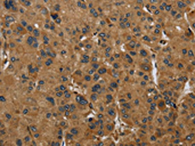 The image on the left is immunohistochemistry of paraffin-embedded Human liver cancer tissue using CSB-PA198597(PAEP Antibody) at dilution 1/60, on the right is treated with fusion protein. (Original magnification: ×200)