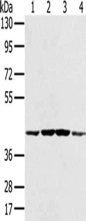 Gel: 8%SDS-PAGE, Lysate: 40 μg, Lane 1-4: Hela cells, K562 cells, Raji cells, Jurkat cells, Primary antibody: CSB-PA921138(PAICS Antibody) at dilution 1/550, Secondary antibody: Goat anti rabbit IgG at 1/8000 dilution, Exposure time: 20 seconds