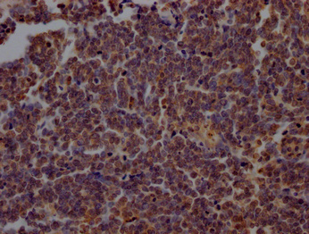IHC image of CSB-PA017457LA01HU diluted at 1:200 and staining in paraffin-embedded human lung cancer performed on a Leica BondTM system. After dewaxing and hydration, antigen retrieval was mediated by high pressure in a citrate buffer (pH 6.0). Section was blocked with 10% normal goat serum 30min at RT. Then primary antibody (1% BSA) was incubated at 4°C overnight. The primary is detected by a Goat anti-rabbit polymer IgG labeled by HRP and visualized using 0.05% DAB.