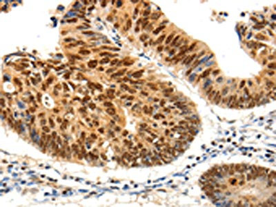 The image on the left is immunohistochemistry of paraffin-embedded Human colon cancer tissue using CSB-PA592469(PDCD6 Antibody) at dilution 1/25, on the right is treated with fusion protein. (Original magnification: ×200)