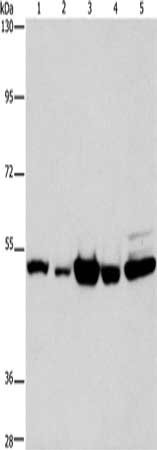 Gel: 8%SDS-PAGE, Lysate: 40 μg, Lane 1-5: Human bladder carcinoma tissue, Human brain malignant glioma tissue, A172 cells, human fetal brain tissue, hela cells, Primary antibody: CSB-PA048149(PDE4D Antibody) at dilution 1/450, Secondary antibody: Goat anti rabbit IgG at 1/8000 dilution, Exposure time: 10 seconds