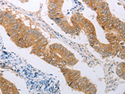 The image on the left is immunohistochemistry of paraffin-embedded Human colon cancer tissue using CSB-PA642637(PDK4 Antibody) at dilution 1/50, on the right is treated with synthetic peptide. (Original magnification: ×200)