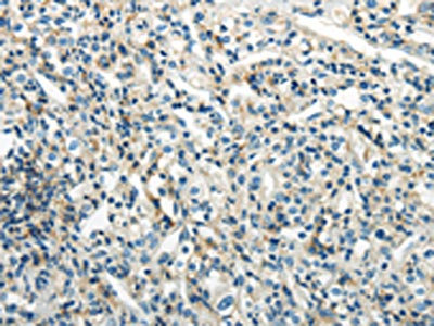 The image on the left is immunohistochemistry of paraffin-embedded Human thyroid cancer tissue using CSB-PA023390(PDPN Antibody) at dilution 1/25, on the right is treated with synthetic peptide. (Original magnification: ×200)