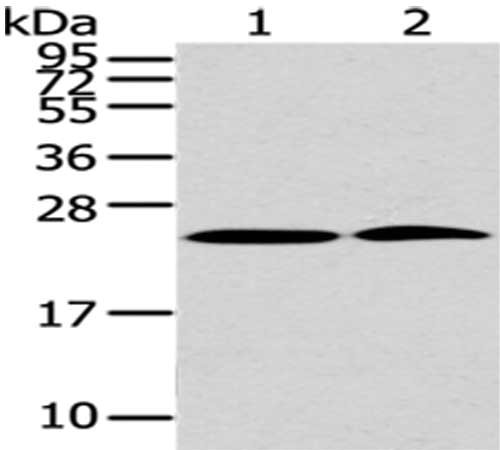 Gel: 12%SDS-PAGE,Lysate: 40 μg,Lane 1-2: 293T cells, Hela cells,Primary antibody: CSB-PA023390(PDPN Antibody) at dilution 1/200 dilution,Secondary antibody: Goat anti rabbit IgG at 1/8000 dilution,Exposure time: 2 minutes