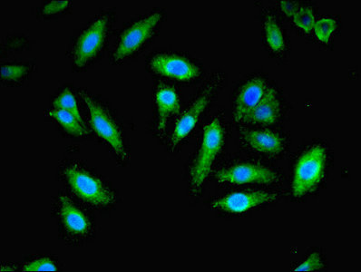 Immunofluorescent analysis of Hela cells using CSB-PA017796LA01HU at dilution of 1:100 and Alexa Fluor 488-congugated AffiniPure Goat Anti-Rabbit IgG(H+L)