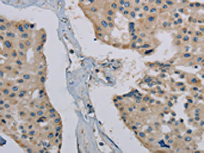 The image on the left is immunohistochemistry of paraffin-embedded Human liver cancer tissue using CSB-PA942630(PHKG1 Antibody) at dilution 1/20, on the right is treated with synthetic peptide. (Original magnification: ×200)