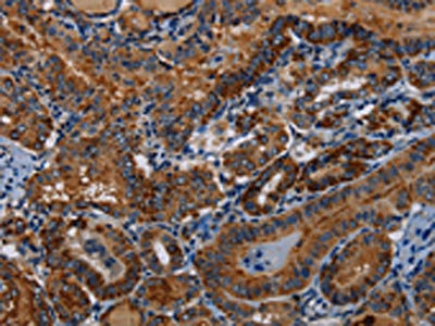 The image on the left is immunohistochemistry of paraffin-embedded Human thyroid cancer tissue using CSB-PA988465(PIDD1 Antibody) at dilution 1/30, on the right is treated with fusion protein. (Original magnification: ×200)