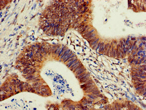 Immunohistochemistry of paraffin-embedded human colon cancer using CSB-PA018005LA01HU at dilution of 1:100