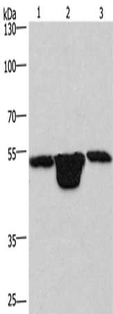 Gel: 8%SDS-PAGE, Lysate: 40 μg, Lane 1-3: Hela cells, mouse muscle tissue, Mouse kidney tissue, Primary antibody: CSB-PA986935(PLEKHO1 Antibody) at dilution 1/200, Secondary antibody: Goat anti rabbit IgG at 1/8000 dilution, Exposure time: 1 minute