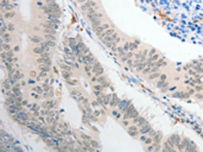 The image on the left is immunohistochemistry of paraffin-embedded Human colon cancer tissue using CSB-PA162244(POU2F1 Antibody) at dilution 1/30, on the right is treated with fusion protein. (Original magnification: ×200)