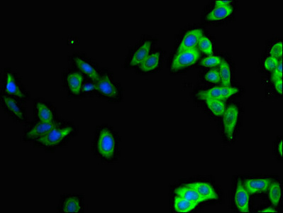 Immunofluorescent analysis of HepG2 cells using CSB-PA018394LA01HU at dilution of 1:100 and Alexa Fluor 488-congugated AffiniPure Goat Anti-Rabbit IgG(H+L)
