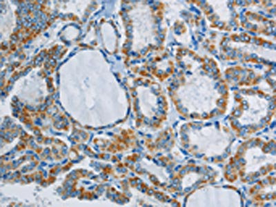 The image on the left is immunohistochemistry of paraffin-embedded Human thyroid cancer tissue using CSB-PA057249(PPARGC1B Antibody) at dilution 1/40, on the right is treated with synthetic peptide. (Original magnification: ×200)