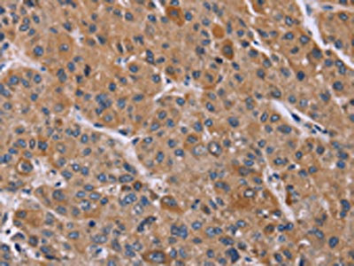 The image on the left is immunohistochemistry of paraffin-embedded Human liver cancer tissue using CSB-PA781876(PPIF Antibody) at dilution 1/45, on the right is treated with fusion protein. (Original magnification: ×200)