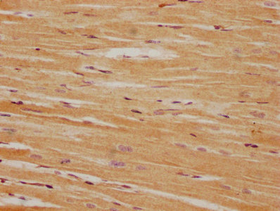 IHC image of CSB-PA722509LA01HU diluted at 1:100 and staining in paraffin-embedded human heart tissue performed on a Leica BondTM system. After dewaxing and hydration, antigen retrieval was mediated by high pressure in a citrate buffer (pH 6.0). Section was blocked with 10% normal goat serum 30min at RT. Then primary antibody (1% BSA) was incubated at 4°C overnight. The primary is detected by a biotinylated secondary antibody and visualized using an HRP conjugated SP system.
