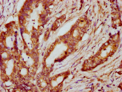 IHC image of CSB-PA018565LA01HU diluted at 1:600 and staining in paraffin-embedded human colon cancer performed on a Leica BondTM system. After dewaxing and hydration, antigen retrieval was mediated by high pressure in a citrate buffer (pH 6.0). Section was blocked with 10% normal goat serum 30min at RT. Then primary antibody (1% BSA) was incubated at 4°C overnight. The primary is detected by a biotinylated secondary antibody and visualized using an HRP conjugated SP system.