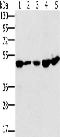 Gel: 8%SDS-PAGE, Lysate: 40 μg, Lane 1-5: 231 cells, Jurkat cells, mouse liver tissue, 293T cells, hela cells, Primary antibody: CSB-PA134529(PSMC2 Antibody) at dilution 1/400, Secondary antibody: Goat anti rabbit IgG at 1/8000 dilution, Exposure time: 5 seconds
