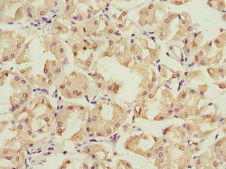 Immunohistochemistry of paraffin-embedded human gastric cancer using CSB-PA018902ESR2HU at dilution of 1:100
