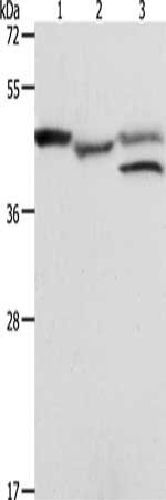 Gel: 10%SDS-PAGE, Lysate: 40 μg, Lane 1-3: K562 cells, mouse heart tissue, MCF7 cells, Primary antibody: CSB-PA643972(PSMD6 Antibody) at dilution 1/900, Secondary antibody: Goat anti rabbit IgG at 1/8000 dilution, Exposure time: 1 minute