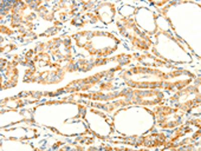 The image on the left is immunohistochemistry of paraffin-embedded Human thyroid cancer tissue using CSB-PA560159(PTGES3 Antibody) at dilution 1/35, on the right is treated with fusion protein. (Original magnification: ×200)
