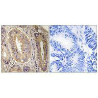 Immunohistochemistry analysis of paraffin-embedded human colon carcinoma tissue, using FAK (Ab-843) antibody.