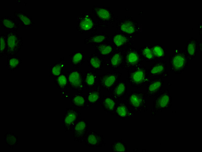 Immunofluorescence staining of Hela cells with CSB-PA623010LA01HU at 1:133, counter-stained with DAPI. The cells were fixed in 4% formaldehyde, permeabilized using 0.2% Triton X-100 and blocked in 10% normal Goat Serum. The cells were then incubated with the antibody overnight at 4°C. The secondary antibody was Alexa Fluor 488-congugated AffiniPure Goat Anti-Rabbit IgG(H+L).