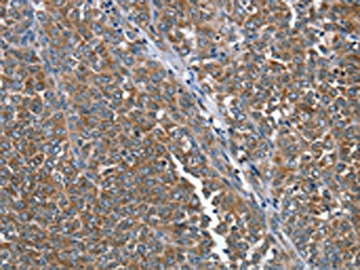 The image on the left is immunohistochemistry of paraffin-embedded Human ovarian cancer tissue using CSB-PA698004(PTRH2 Antibody) at dilution 1/20, on the right is treated with fusion protein. (Original magnification: ×200)