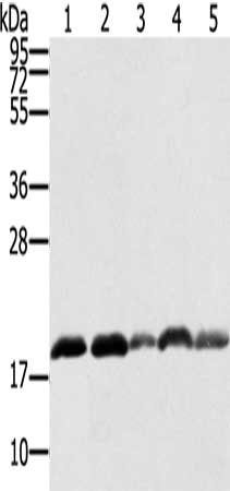 Gel: 12%SDS-PAGE, Lysate: 40 μg, Lane 1-5: K562 cells, hepg2 cells, 231 cells, Jurkat cells, Raji cells, Primary antibody: CSB-PA698004(PTRH2 Antibody) at dilution 1/250, Secondary antibody: Goat anti rabbit IgG at 1/8000 dilution, Exposure time: 20 seconds