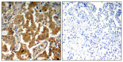 Immunohistochemical analysis of paraffin-embedded human lung carcinoma tissue using ADD1(Phospho-Ser726) Antibody(left) or the same antibody preincubated with blocking peptide(right).