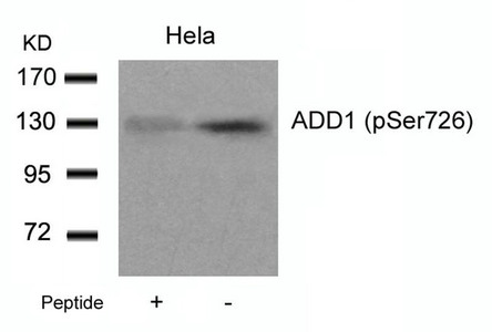 Western blot analysis of extracts from Hela cells using ADD1(Phospho-Ser726) Antibody and the same antibody preincubated with blocking peptide.