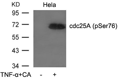 Western blot analysis of extracts from Hela cells untreated or treated with TNF-a and CA using cdc25A(Phospho-Ser76) Antibody.