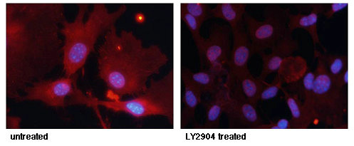 Immunofluorescence staining of methanol-fixed MEF cells untreated or treated with LY2904 using FKHR (Phospho-Ser256) Antibody.
