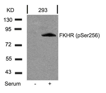 Western blot analysis of extracts from 293 cells untreated or treated with serum using FKHR(Phospho-Ser256) Antibody.