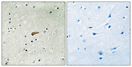 Immunohistochemical analysis of paraffin-embedded human brain tissue using FRS2 (Phospho-Tyr436) antibody (left)or the same antibody preincubated with blocking peptide (right).