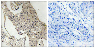Immunohistochemical analysis of paraffin-embedded human breast carcinoma tissue using Gab2 (Phospho-Ser623) antibody (left)or the same antibody preincubated with blocking peptide (right).