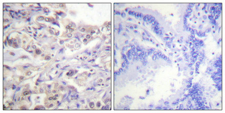 Immunohistochemical analysis of paraffin-embedded human lung carcinoma tissue using hnRPD (Phospho-Ser83) antibody (left)or the same antibody preincubated with blocking peptide (right).