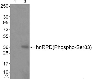 Western blot analysis of extracts from JK cells (Lane 2), using hnRPD (Phospho-Ser83) Antibody. The lane on the left is treated with antigen-specific peptide.