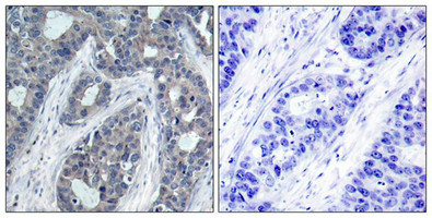 Immunohistochemical analysis of paraffin-embedded human breast carcinoma tissue using IRS-1(Phospho-Ser636) Antibody(left) or the same antibody preincubated with blocking peptide(right).