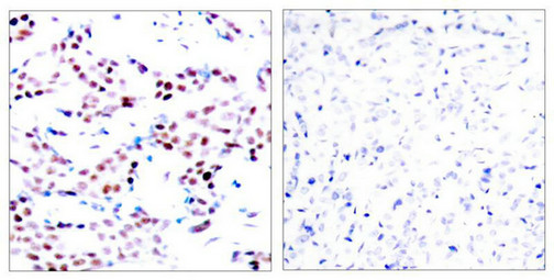 Immunohistochemical analysis of paraffin-embedded human breast carcinoma tissue using c-Jun(Phospho-Thr91) Antibody(left) or the same antibody preincubated with blocking peptide(right).