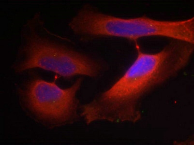 Immunofluorescence staining of methanol-fixed Hela cells using Keratin 8(Phospho-Ser74) Antibody.