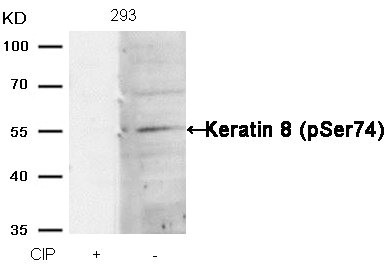 Western blot analysis of extracts from 293 cells, treated with calf intestinal phosphatase (CIP), using Keratin 8 (Phospho-Ser74) Antibody.