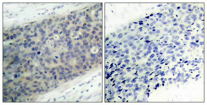 Immunohistochemical analysis of paraffin-embedded human breast carcinoma tissue using LIMK2(Phospho-Thr505) Antibody(left) or the same antibody preincubated with blocking peptide(right).