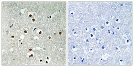 Immunohistochemical analysis of paraffin-embedded human brain tissue using MEF2C (Phospho-Ser396) antibody (left)or the same antibody preincubated with blocking peptide (right).