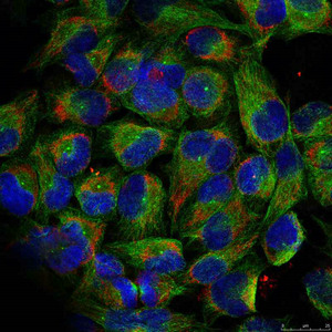 Immunofluorescence staining of methanol-fixed HeLa cells using NF-kappa;B p100 (phospho-ser866) antibody.