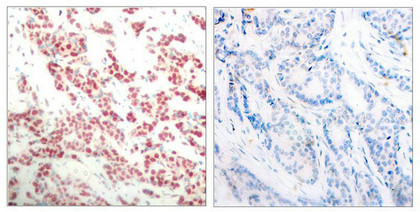 Immunohistochemical analysis of paraffin- embedded human breast carcinoma tissue using NF-κB p100 (phospho- ser866) antibody.