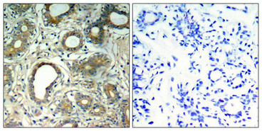 Immunohistochemical analysis of paraffin-embedded human breast carcinoma tissue using SHP-2(Phospho-Tyr580) Antibody(left) or the same antibody preincubated with blocking peptide(right).