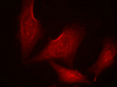 Immunofluorescence staining of methanol-fixed HeLa cells using NF-kappa;B-p65 (phospho-Ser311) antibody.