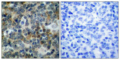 Immunohistochemical analysis of paraffin-embedded human tonsil carcinoma tissue using VASP(Phospho-Ser239) Antibody(left) or the same antibody preincubated with blocking peptide(right).