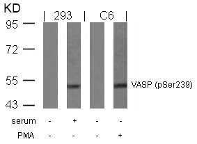Western blot analysis of extracts from serum-treated 293 and PMA-treated C6 cells using VASP(Phospho-Ser239) Antibody.