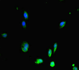 Immunofluorescent analysis of Hela cells using CSB-PA019268LA01HU at dilution of 1:100 and Alexa Fluor 488-congugated AffiniPure Goat Anti-Rabbit IgG(H+L)