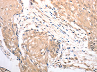 The image on the left is immunohistochemistry of paraffin-embedded Human cervical cancer tissue using CSB-PA279438(RAD52 Antibody) at dilution 1/25, on the right is treated with synthetic peptide. (Original magnification: ×200)